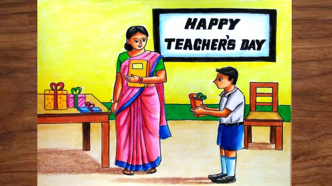 In the next idea, a student is giving a gift to the teacher and already there are many other gifts as well on the table of the teacher. It is among the colorful Teacher’s Day drawing ideas.