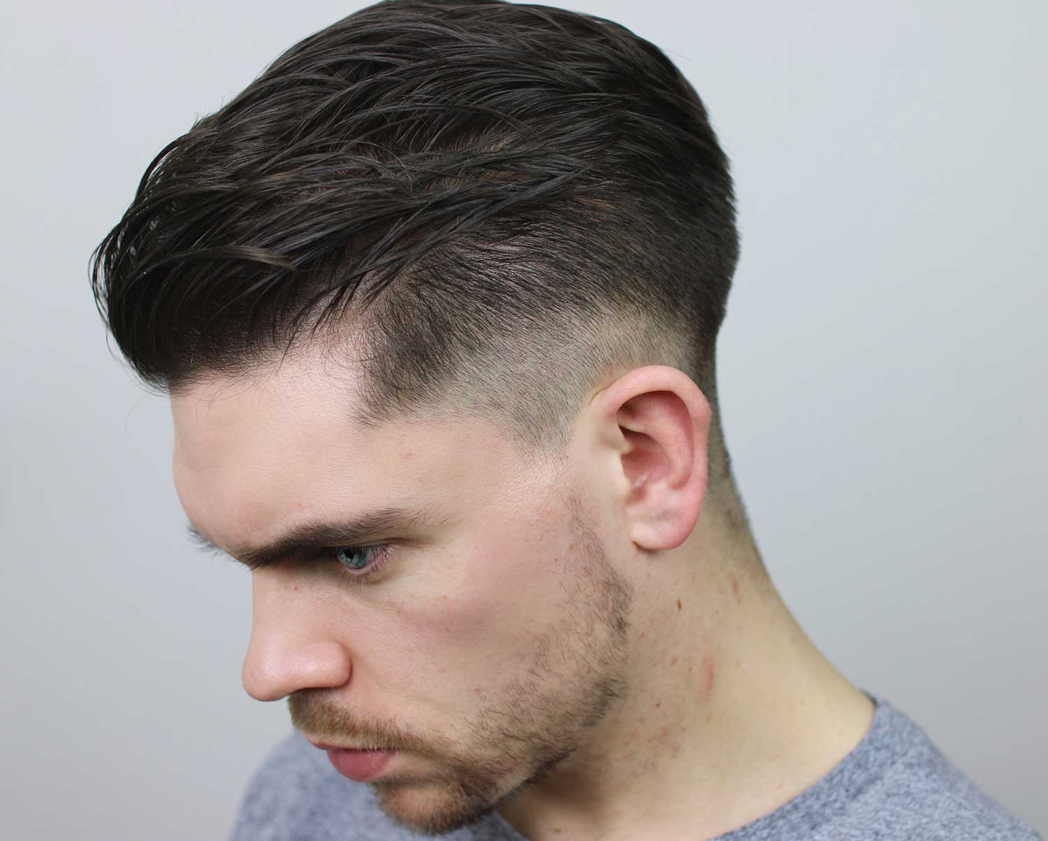 Ideal for short hair, this fade starts low and creates a smooth transition from the short sides to the slightly longer top.