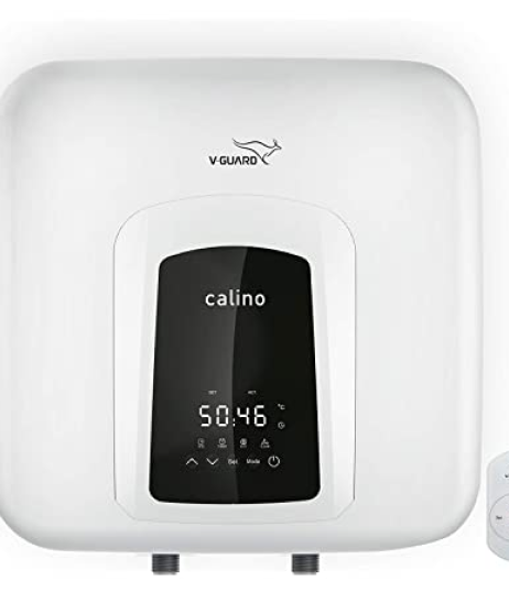 The V-Guard Calino DG has a water storage capacity of 25 liters. The geyser has a remote control and a digital monitor that displays the time and temperature.