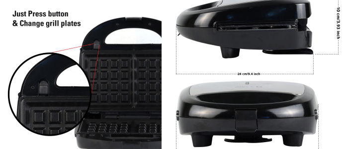 - Featuring detachable plates for hassle-free cleaning and 3 interchangeable non-stick cooking plates for sandwiches, waffles, and grilling, it offers versatility like no other.