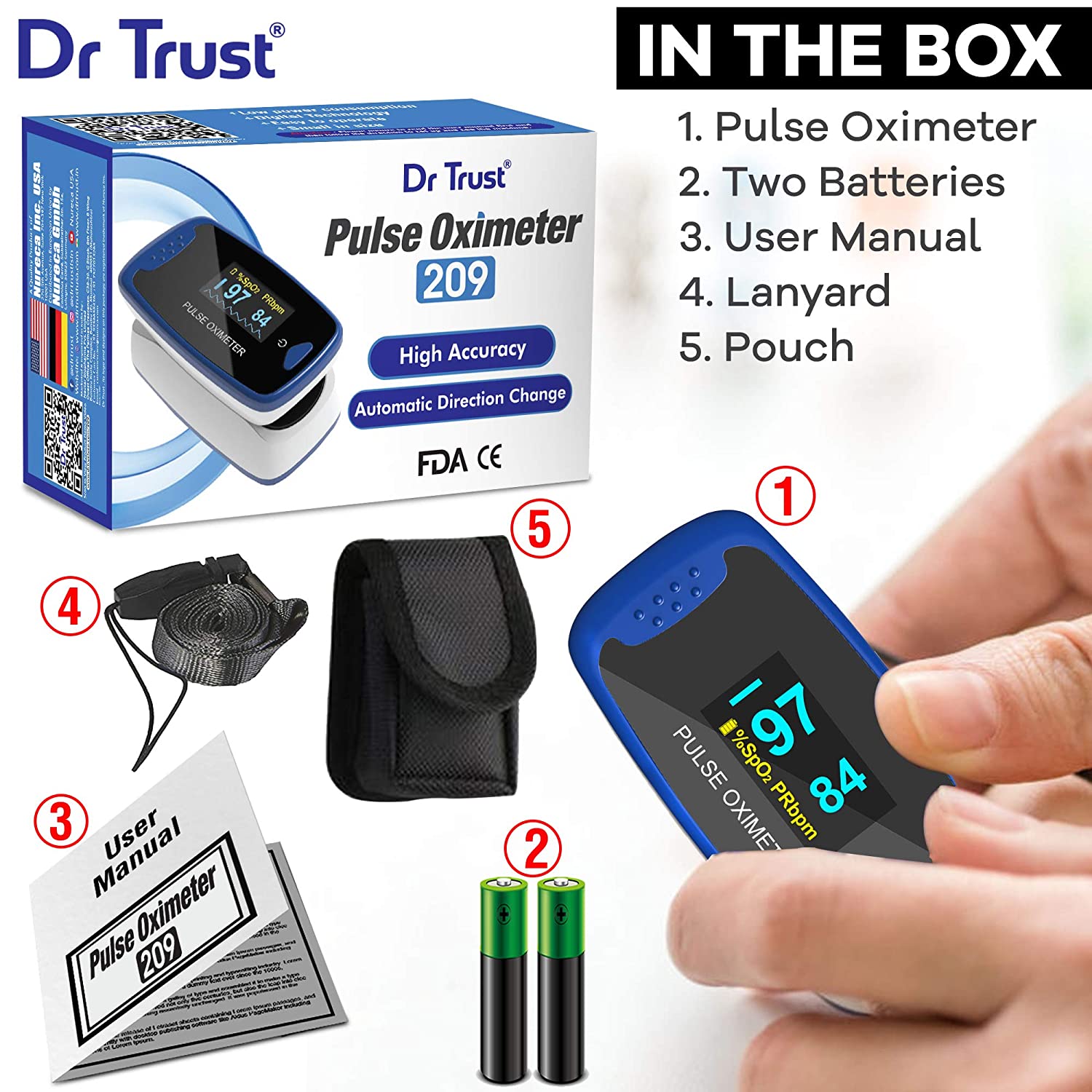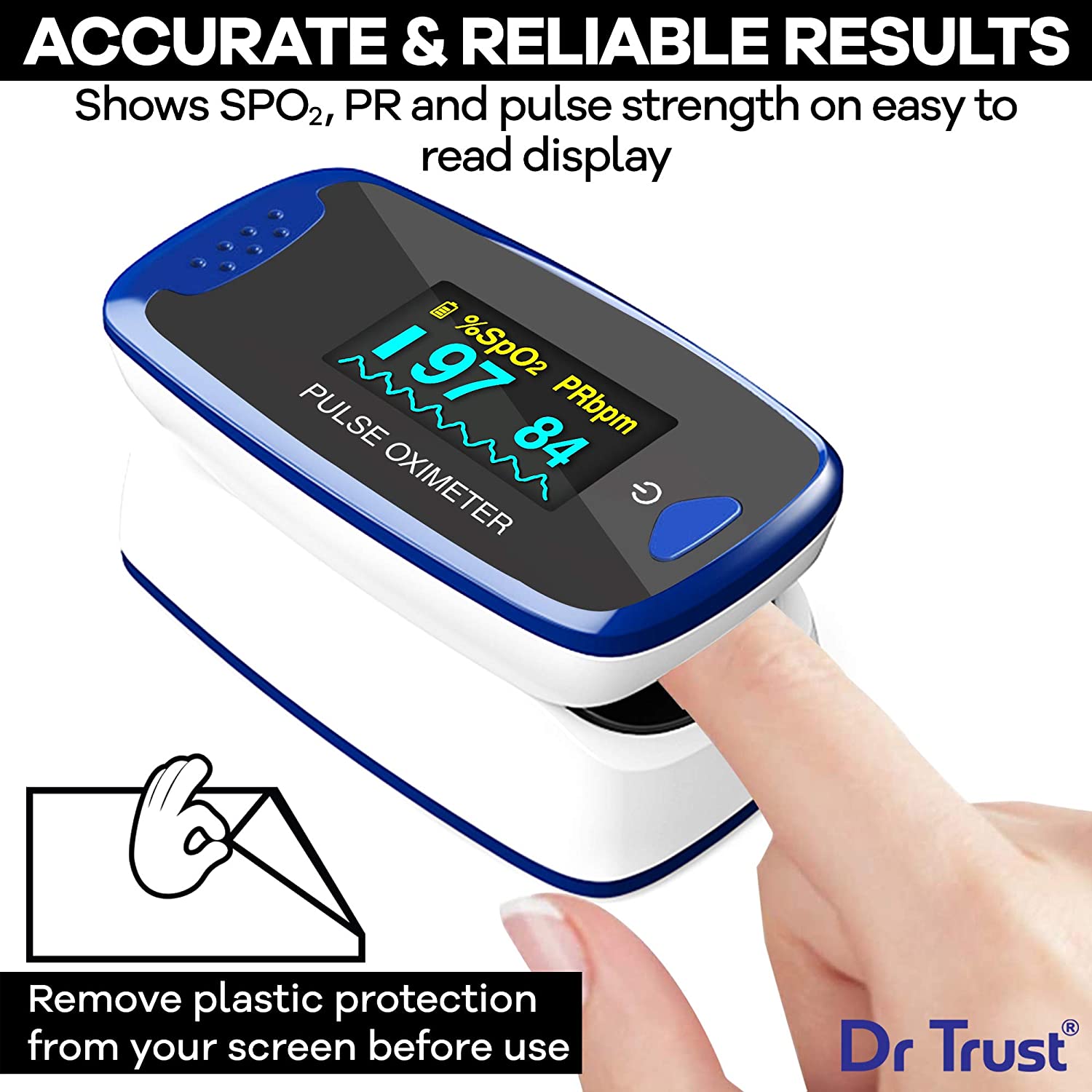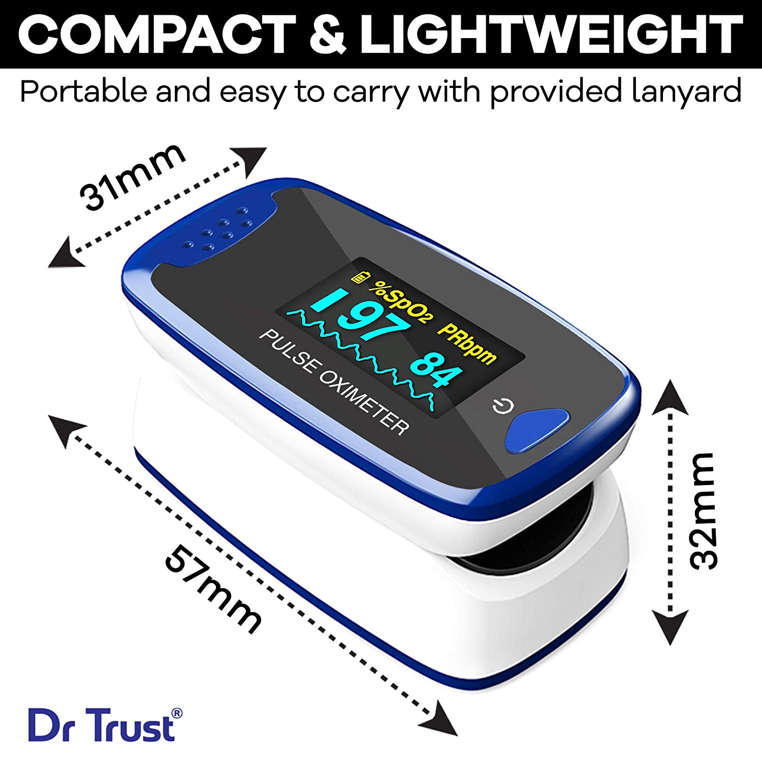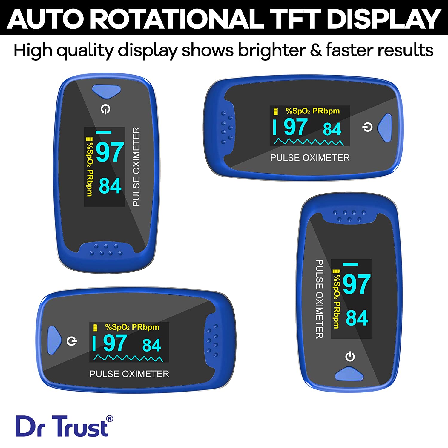 Dr trust USA professional series pulse rate and alarm function US FDA and CE approved: The newly upgraded Dr Trust Finger Pulse Oximeter is an affordable and accurate way to check pulse rates and blood oxygen saturation levels. Simple one-button design allows for easy operation. Small portable size makes it easy to handle and carry. Helpful for athletes and pilots to obtain quick and accurate oxygen saturation readings. This is the best pulse oximeter available for medical professionals. The product is water resistant and contains audio visual alarm. US FDA and CE approved. Dr Trust is a registered trademark of Nectar Biopharma Private Limited.