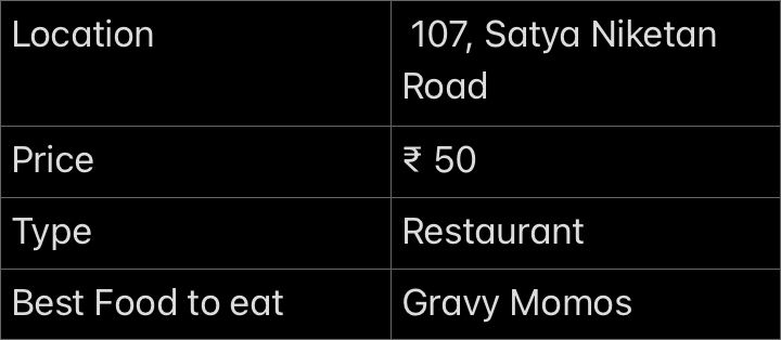 If you love momos then this food outlet will definitely be a blessing to your tastebuds , known best for It’s Gravy Momos , this place is located near Satya Niketan. They serve hot Momos Served with a spicy chutney. The Gravy Momos are served with a thick gravy which will make your tastebuds feel like heaven.