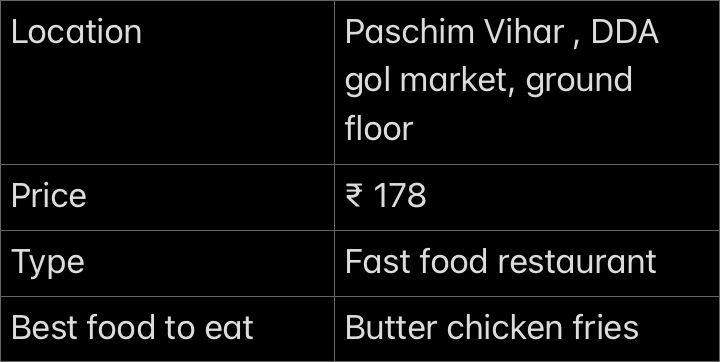 From pizzas, burgers, shakes you’ll find everything here. Best known for it’s Butter chicken fries , served with hot fries dipped in butter chicken gravy, loaded with chunks of chicken. This place is located in paschim vihar, these delicious fries are worth a visit.