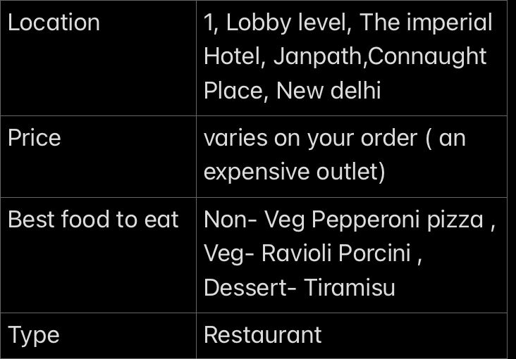 If you love Italian food then this restaurant will suit you the best as it has a range of Italian classics. You can never go wrong with Italian food here. Overall food is great here. This place is located near the imperial hotel.