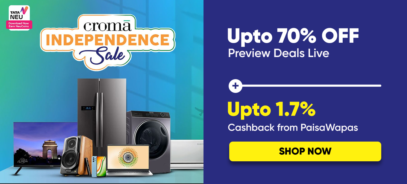 Grab huge deals during the 2023 Independence Day sale on large home appliances with Croma. As croma gives out some jaw-dropping deals on the best home products. Mobile, Laptops, Large Appliances, Kitchen appliances, Grooming, Gaming, and more categories get UPTO 70% OFF on the top products that you buy. And by shopping Via PaisaWapas get UPTO 1.7% Cashback. Shop more of this during the 77th Independence Day sale on Croma and get huge discounts.