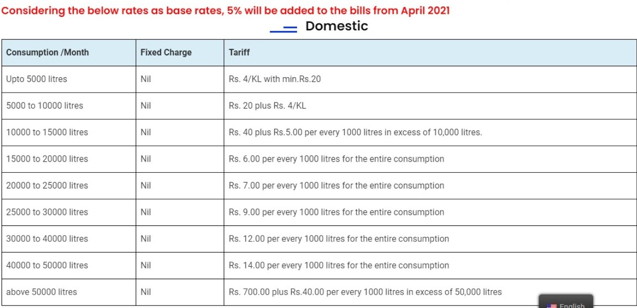 - Up to 5,000 liters per month – Rs 4 per KL with a minimum of Rs 20