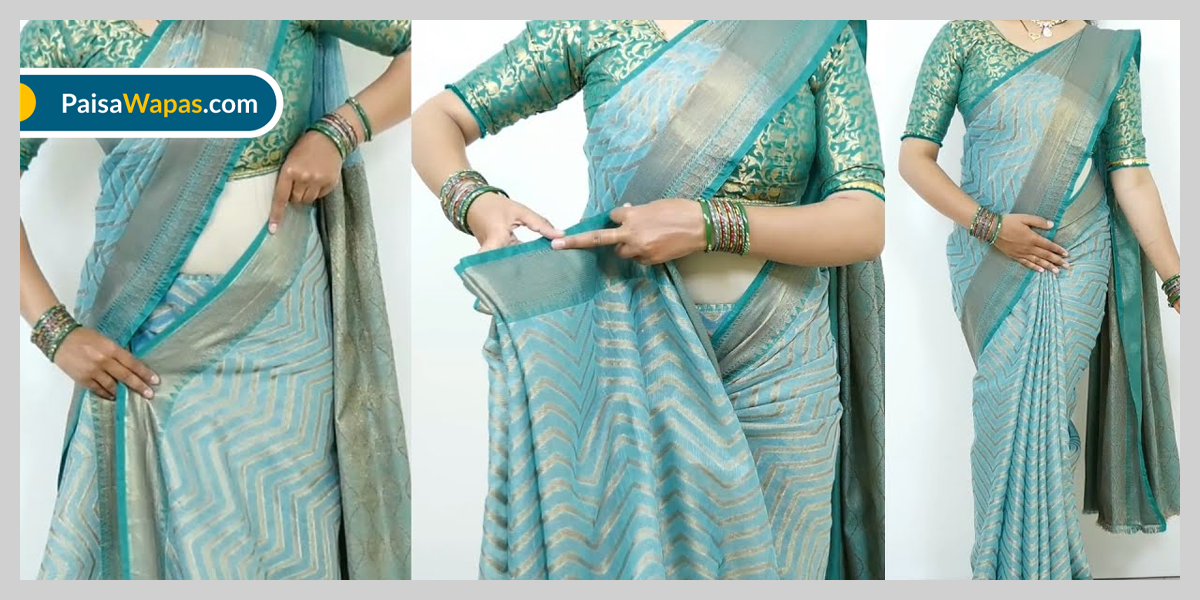 Belt style saree draping is in great trend all over the country. For self saree draping in this style, you need to drape your saree normally as you wear. Then, accessorize it with a classic broad belt that properly cinches the pallu of the saree from the waist. You can also try a traditional kamarbandh to give a vintage look with modern feels. In addition to this saree draping style, you can style an off-shoulder blouse and any other classic blouse styles that are trending in today’s time.