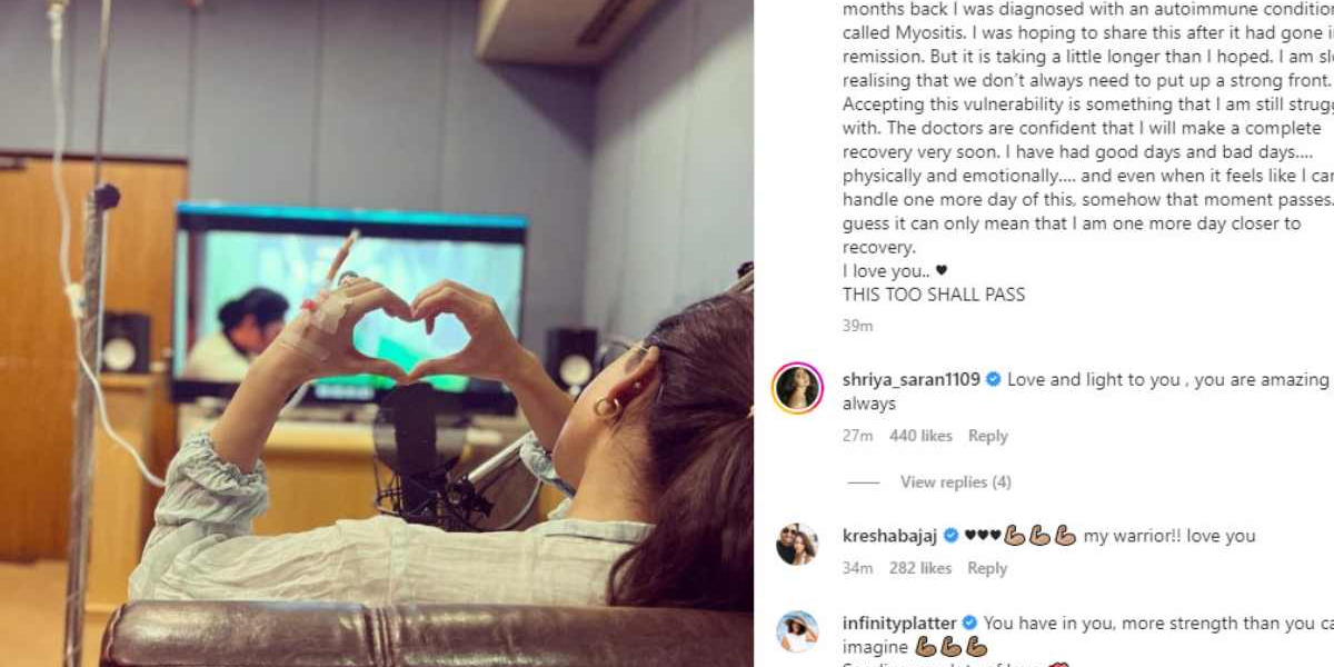 This post gained a lot of prayers and positive thoughts from celebrities and her fan base. One from Janhvi kappor while the other from Akil. Most of the comments read ‘More power to you’,Love and light to you , you are amazing always, You’re one of the strongest people I know, and i am sure, you’ll be back with a bang!Sending you lots of love and strength .