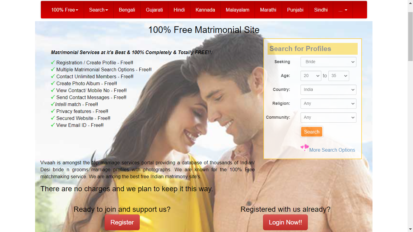 Vivaah.com is the only Indian matrimonial site that provides free services to people to find their matches. This website follows the objective of “Search for a life partner should not come with a price tag”. It is true money shouldn’t affect the relationship it should always be love and understanding.