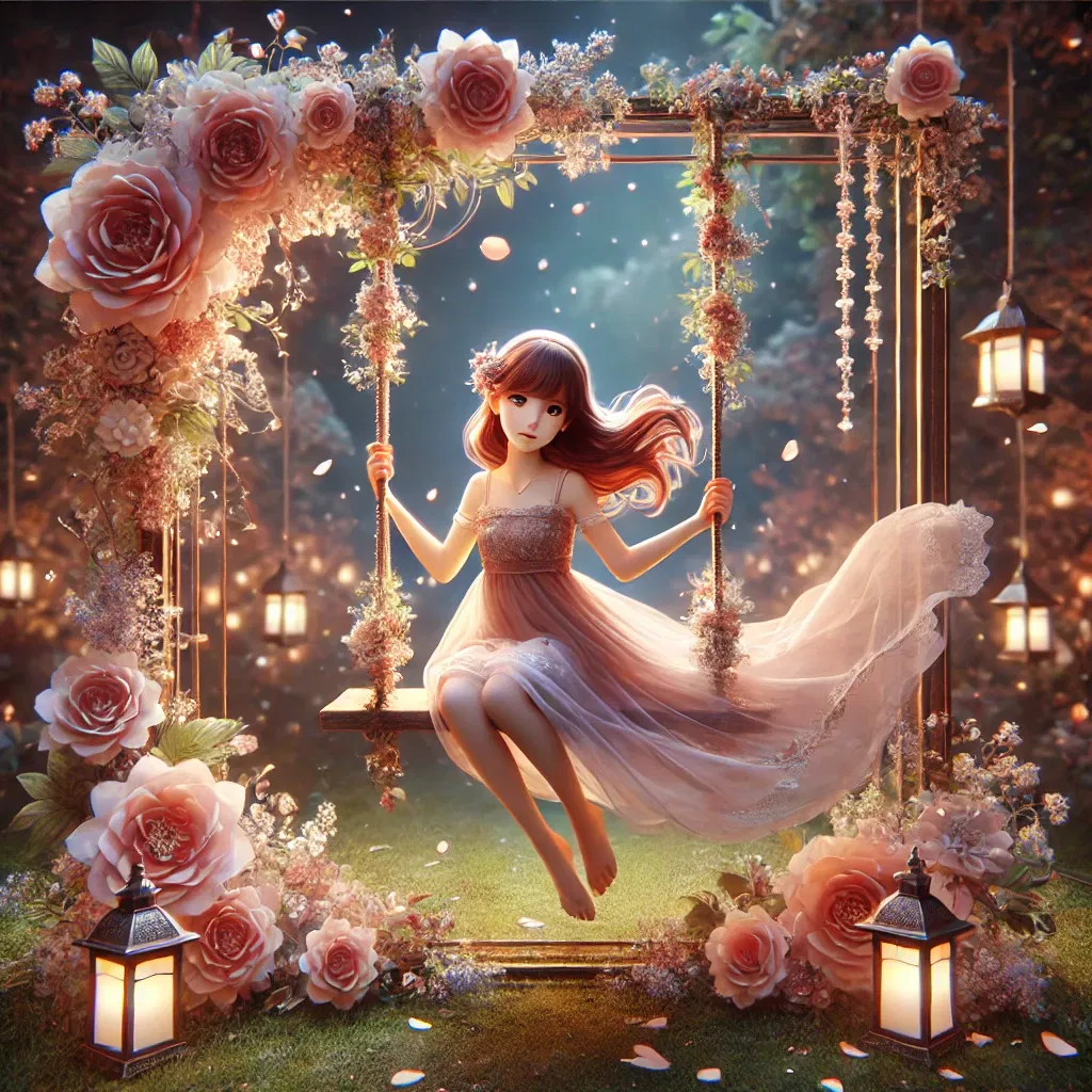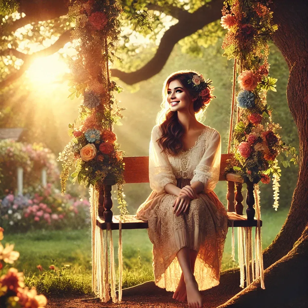 This image of an elegantly sitting young girl has just been beautifully decorated with soft, dainty flowers over a swing. The backdrop is soft and dreamy with fall leaves, making this image very endearingly ethereal with elements that reveal serenity and love for nature. She holds a book in her hand; lost in her world, she embodies serenity and intellectual depth. It is well suited as a WhatsApp DP symbolizing peace, creativity, and introspection; it is perfect for book lovers or nature enthusiasts.