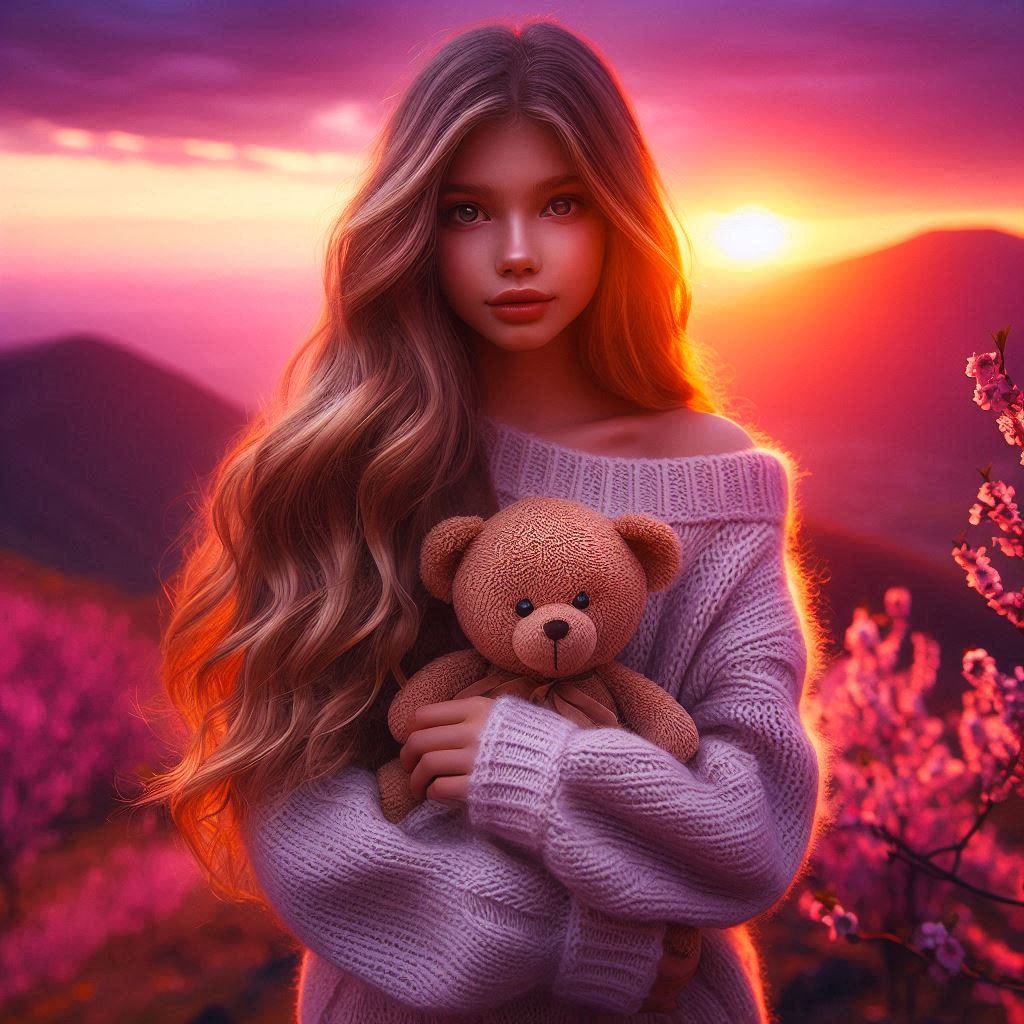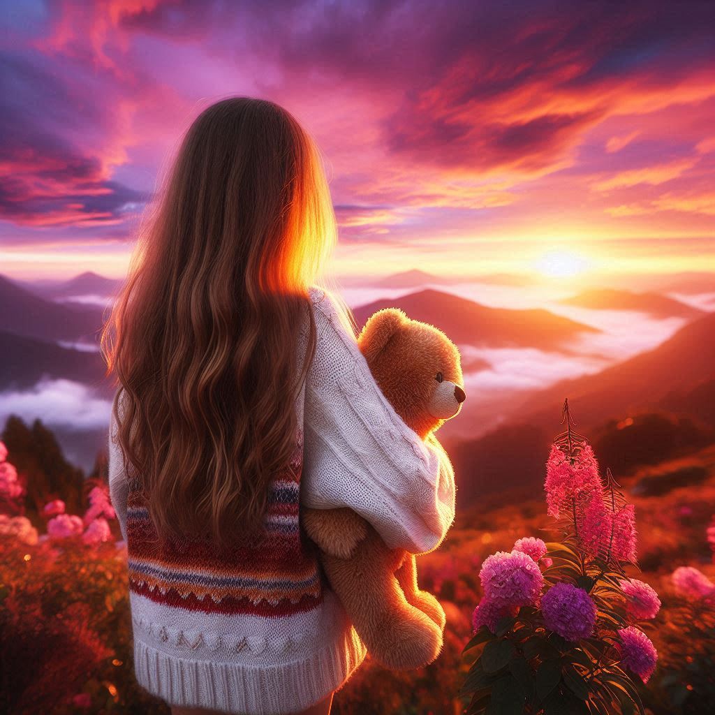 A heartwarming scene of a girl sitting on a dock, watching the sunset with her teddy bear by her side. The golden hues of the setting sun, the tranquil water, and the nostalgic vibe create an aura of serenity and warmth. This DP is perfect for those who cherish simplicity, childhood memories, and the beauty of quiet companionship. It’s a touching symbol of love, solitude, and a deep connection to nature.
