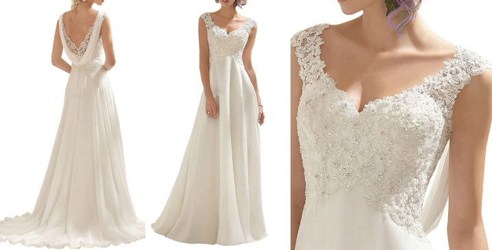 Graceful and light, this white dress wedding option with an empire waist offers comfort without sacrificing style. The high waistline and flowing fabric cater to a variety of body types, making every bride feel like royalty.